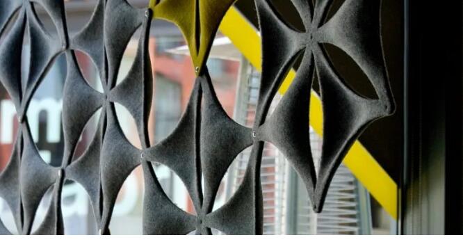 在室内声学设计中,无纺布越来越多地被用作可消音的“设计元素”。例如装在墙面和/或顶棚上的单块镶嵌板、整面的墙面装饰和吊顶、开放式办公区域用的消音隔板,或者用毛毡制造的整件家具。
