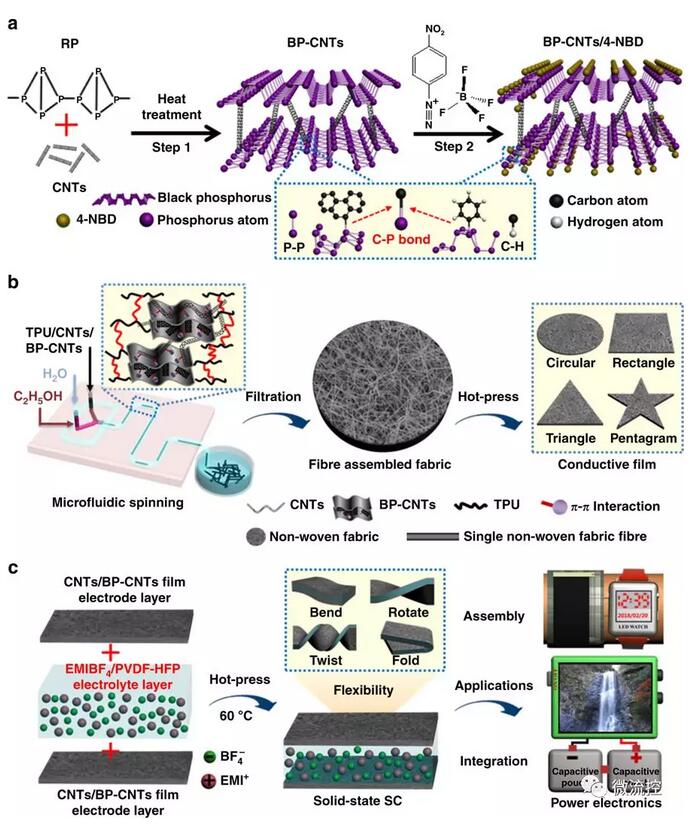 据研究组陈苏教授和吴冠教授介绍,该团队将碳纳米管原位桥接在导电性差的黑磷材料层之间,大大提高了层间电子转移效率。此外,由于黑磷易于像石墨烯一样在层间堆积,添加碳纳米管有效地减少了黑磷层的积累,增加了比表面积,增加了离子吸附表面,增加了离子的扩散速率和积累,并使黑色磷具有大的离子扩散通道。此外,该团队采用黑色p复合纺丝溶液,通过微流体纺丝技术拉制,固化并融合到黑色p微纳米复合纤维的无纺电极材料中,具有高功能导电性,高能量密度和优异的柔性超级电容器。灵活的超级电容器具有高度的灵活性和变形能力,可以集成到织物中,为可穿戴设备提供能量。